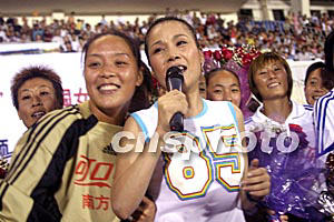 直到比赛开始后5分钟,先农坛体育场外仍有大量等着要票的球迷,这一切源于人们对女足的关爱。开球前,载着38位南北女侠的38辆摩托车缓缓驶入球场,在与著名歌星田震共同高歌《风雨彩虹·铿锵玫瑰》这首女足之歌后,队员们手捧着鲜花拥向前来为她们助威的“抗非典”女英雄们。女足姑娘们的精彩表演给了现场球迷至高享受,同时也为她们自己赢来了巨额的奖金,获胜的北方队得奖10万元,而南方队也有5万元之多的安慰。两队的进球功臣白洁、韩端因为优异的表现开走了两辆奖品摩托车。