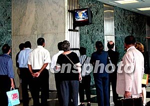 联合国驻巴格达总部大楼十九日被炸后,纽约联合国总部的工作人员聚集在大厅内的电视机前收看新闻,关注着在巴格达同事的安全。中新社记者:赵海燕