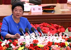 中共中央政治局常委李长春代表中共中央向大会致辞,他表示要进一步紧密团结港澳台妇女同胞。中新社记者:廖文静