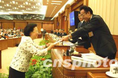十届全国人大常委会第四次会议今天上午在北京人民大会堂举行,全国人大常委会副委员长李铁映在会上主持了任命书颁发仪式。