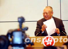 香港特首董建华8月28日在出席深港西部通道的奠基典礼后,在香港政府总部召开记者会,转达国务院副总理曾培炎对港粤经验合作的重视和对香港经济的支持。作者:洪少葵