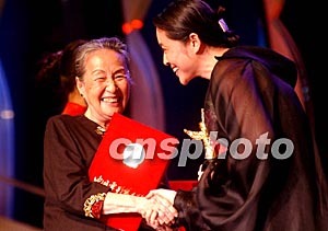 中国电影第九届华表奖三十日晚在北京北展剧场揭晓,在《世界上最疼我的那个人去了》中饰演主角的黄素影与在《美丽的大脚》中饰演主角的倪萍荣获优秀女演员奖。中新社记者:武仲林