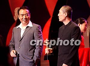 中国电影第九届华表奖三十日晚在北京北展剧场揭晓,张艺谋导演的《英雄》获特殊贡献奖与优秀对外合拍片两项大奖。图为陈凯歌为张艺谋颁发特殊贡献奖。中新社记者:武仲林