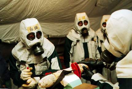 具体的处理程序是:金属探测————先通过电磁探测,测出毒弹掩埋的准确边际,确定挖掘的方位;挖掘作业————使用铜针、铜铲等器具,小心将已经锈蚀、渗漏的毒气弹挖掘出来;冷却处理————将挖掘出的毒气弹放置到零下40℃的冷藏柜,进行12个小时的冷却,使毒气弹温度降到零下30℃;X光鉴别————通过大功率X光鉴别,搞清楚毒弹内部结构;弹、药分离———将弹体切割;外形鉴别;密封包装。