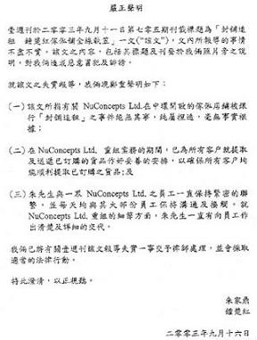 (一)该文所指有关NuConcepts Ltd.在中环开设的家俬店铺被银行“封铺追租”之事件绝无其事,纯属捏造,毫无事实根据;(二)在NuConcepts Ltd.重组业务的期间,已为所有客户就提取及送递已订购的货品作好妥善的安排,以确保所有客户均能顺利提取已订购之货品;(三)朱先生与一众NuConcepts Ltd.之员工一直保持紧密的联系,并每天均与其大部分员工保持沟通及接触。就NuConcepts Ltd.重组的细节方面,朱先生一直有向员工作出清楚及详细的交代。