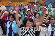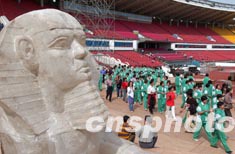 大批身穿便装的群众演员十九日正在北京工人体育场参加大型户外景观歌剧《阿依达》的彩排。意大利著名歌剧《阿依达》将于九月二十七日在北京演出。此次演出规模空前,仅群众演员就达到4600多人。中新社记者:张炜