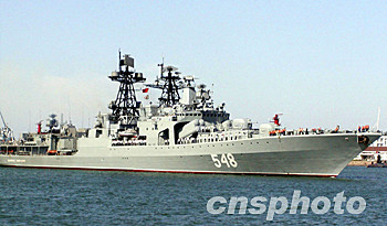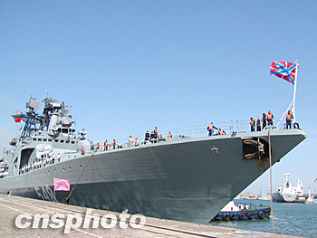 中国海军北海舰队某驱逐舰支队“哈尔滨”号导弹驱逐舰执行海上礼仪并陪访。“哈尔滨”舰曾于1996年7月26日至8月2日,应俄罗斯海军邀请参加俄海军建军300周年庆祝活动,当时“潘捷列耶夫海军上将”号大型反潜舰是“哈尔滨”舰的陪访舰。(米晋国)