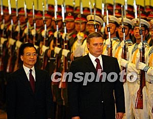 国务院总理温家宝今天上午在人民大会堂北大厅主持仪式,欢迎出席完上海合作组织成员国总理第二次会晤的卡西亚诺夫正式访华。
