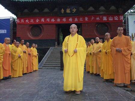 少林寺方丈释永信在少林寺山门前主持盛大的欢迎仪式。释永信在致欢迎词时说:“嵩山论剑--中国互联网新闻宣传高峰论坛在少林寺召开,少林古刹古老的文明和现代科技将在这里碰撞与对接。