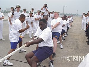 23日,中美海军首先进行了拔河友谊比赛。拔河比赛应该说是中国海军水兵的强项,在97年南海舰队对美洲四国五港的访问中,中国海军水兵拔河队一路上攻城拔寨、未尝败绩。但这次美国水兵拔河队是有备而来,且来者不善。15名队员个个膀大腰圆、粗壮结实,比如,其中一名黑人队员桑塔纳(SANTANA),此人身高199CM,体重250斤,来自美国亚特兰大,是舰上的武器部门人员。中方队员与对手相比在块头上明显吃了亏,处于劣势。比赛开始前,美方队员围在一起,大声鼓劲。比赛开始后,中方水兵拔河队奋力与对手展开拉锯战,虽拼尽全力,无奈实力稍逊一筹,最后不无遗憾地输掉比赛,美国水兵也算报了上次比赛的一箭之仇。