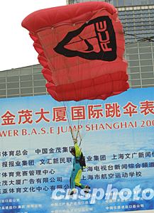 世界顶级高楼跳伞运动员如雄鹰展翅般从中华第一高楼上海金茂大厦的八十八层平台纵身飞跃,骤然降落,那一朵朵色彩纷呈的伞花飘逸而下,博得在场观众的阵阵喝彩。今日有着“中华第一跳”美称的上海金茂大厦高楼跳伞着实让一向见多识广的申城市民大开眼界,随着跳伞表演的如期举行,一切相关的悬念也随之揭开了神秘的面纱。