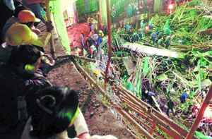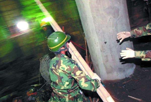 昨天晚上8时30分,记者在抢险现场守侯,一名因疲劳过度的三水拆船厂的抢险工人从工地走出来,记者立即围上前询问现场抢险救援的情况。该工人说,他们是昨天上午11时许接到拆船厂负责人的指示,要他们立即集合前往新会一发生倒塌事故的建筑工地上救人,于是他们穿上工作服就来了。据介绍,他们大约来了30人左右,分为三班倒。他们实施抢救的主要步骤时,首先将高空中坠落地面的大约100多平方米的铁板用电焊将他们烧开,用大型的吊车将铁板吊开,然后再将压在地下的工人从铁板下“拔”出来。主要的困难是铁板从高空坠下,其速度非常快,在惯性的作用下,将众多的杂物如竹子、木头、铁棍等夹杂在其中。预计下面被埋的还有10人左右,他们正与抢险的其他工人争分夺秒,估计将通宵抢险。