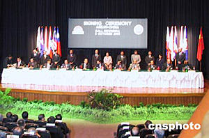 中新网巴厘岛10月8日电(记者齐彬)中国外交部长李肇星八日在这里与东盟十国外长签署文件,宣布中国正式加入《东南亚友好合作条约》,从而使中国成为东南亚地区以外第一个加入该条约的大国,中国国务院总理温家宝与东盟十国领导人共同出席了签字仪式。