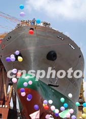 中新社上海十月九日电(记者褚婷婷)为适应运输轻轨列车等大型设备的需要,载重三万吨的多用途重吊货轮——“中波明月”号,今天中午在上海船厂二号船台下水。据悉,这种货轮是当今世界件货航运市场上最先进、规模最大的运输工具,它的建成及不久后的投入营运,将有力提升中国在世界杂货运输航线上的竞争力。