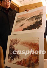 中贸圣佳国际拍卖公司2003年拍卖会将于十一月一日在北京举行,傅抱石作品《毛主席诗意山水册八开》等稀罕珍品成为拍品中一道靓丽风景。该画作由傅抱石先生在1964、1965年内为生前挚友维桢所绘,是作者经心阅读《毛泽东诗词》后激情创作的八幅佳构。图为工作人员十月中旬展示其中的两幅《寥廓江天万里霜》(下)与《芙蓉国里尽朝晖》。中新社记者:武仲林