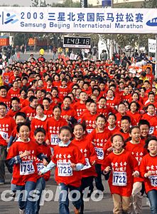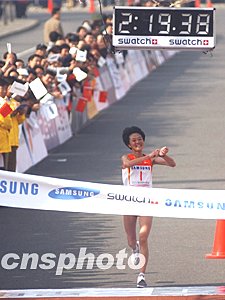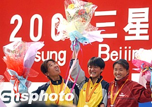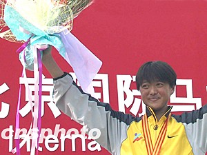 前不久在法国巴黎世界田径锦标赛上取得一枚铜牌的孙英杰是二00三年三星北京国际马拉松赛女子组唯一的夺冠“大热门”。在比赛过程中,孙英杰始终处于领跑的第一集团之中,并于后半程脱颖而出,最终以二小时十九分三十九秒的成绩轻松夺得女子组冠军,创造北京国际马拉松赛女子组历史最好成绩。