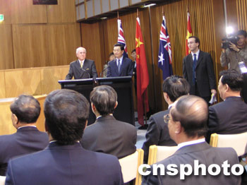 中国国家主席胡锦涛和澳大利亚总理霍华德10月24日在联邦大厦联合会见中澳记者。作者:刘雨生