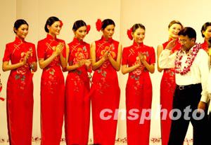 图为观看表演的巴基斯坦总统穆沙拉夫为身穿大红旗袍的佳丽们敬礼喝采。