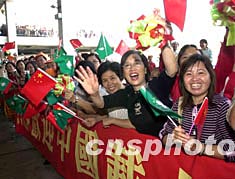 中国载人航天飞行代表团团长胡世祥、副团长张庆伟及航天员杨利伟一行在港澳码头受到了澳门各界人士的热烈欢迎,中央驻澳联络办主任白志健以及澳门特区政府代表、运输工务司司长欧文龙等到码头迎接。近千名澳门中小学生和各大社团代表,打着横幅、挥舞国旗和澳门区旗,夹道欢迎航天英雄的到来。当杨利伟一行步出码头出境大厅时,人群中爆发出一阵阵欢呼声。四名小学生向胡世祥、张庆伟、杨利伟和总设计师王永志献花,杨利伟等向欢迎人群挥手致意,并不时同人们握手,感谢澳门同胞的盛情。