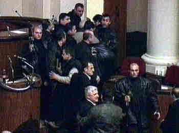 22日下午,数千名格鲁吉亚反对派闯入格鲁吉亚总统谢瓦尔德纳泽正在发表演说的国会大楼内,谢瓦尔德纳泽仓促离开国会大厦。(路透社图)