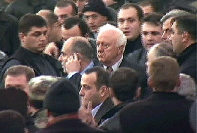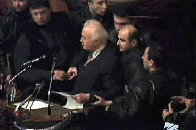 11月22日,格鲁吉亚新一届议会举行第一次会议。当谢瓦尔德纳泽在议会演讲时,几十名反对派人士冲入议会大厦,要求总统辞职。总统的支持者和反对派人士发生争执,议会大厅一片混乱。谢瓦尔德纳泽随即在保镖的保护下撤离,并表示拒绝辞职。
