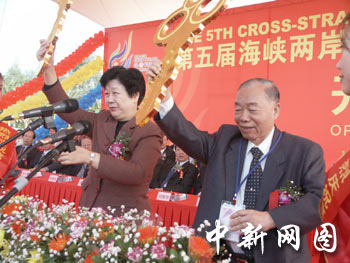 全国政协副主席张克辉与福建省委副书记、省纪委书记梁绮萍女士,在第五届海峡两岸(福建漳州)花卉博览会开幕仪式上,共同转动此次盛会的金钥匙。蔡文原摄