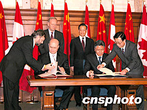 会谈后,两国总理在议会大楼议会阅览室出席了《中华人民共和国交通部与加拿大运输部公路、水路交通技术合作谅解备忘录》等七个双边合作文件的签字仪式并共同会见了记者。温家宝高度赞扬了克雷蒂安总理在他十年任职期间为发展中加两国友好关系所做出的贡献,并期待着与候任总理马丁进一步充实和深化中加全面合作伙伴关系。