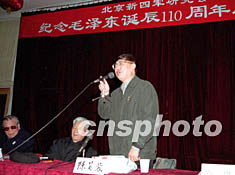 十二月十六日,北京新四军研究会在京隆重举行“纪念毛泽东诞辰一百一十周年座谈会”,新四军研究会会长张铚秀将军(中),副会长鲁冰将军(左),副会长、中国人民对外友好协会会长陈昊苏(右)与新四军所属各师分会代表近二百人共同缅怀了毛泽东领导人民驱逐日寇,建立新中国,开拓中华复兴之路的丰功伟绩。作者:徐曦弋