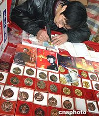 元旦期间湖南韶山的旅游商品摊点上,摊主忙着为游客在仿制的毛泽东像章上刻名留念。新年假期,参观毛泽东故乡的游客剧增。中新社记者:宋吉河
