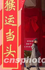 中国传统农历猴年来临之际,一家大型商场打出“猴运当头”(谐音“鸿运当头”)的贺岁标语。随着春节临近,北京街头大红灯笼和贺岁标语比比皆是。中新社记者:张炜