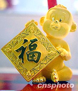 2004年1月17日,安徽省淮北市一家珠宝首饰店内一尊尊纯金打造栩栩如生的“金猴”,准备在春节黄金周期间,吸引消费者选购。猴年将至,猴金饰品日益成为人们的新宠。谢正义 摄