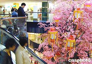 香港太古城装饰新年装饰,巨大的桃花树上悬挂宫灯,营造节日气氛。作者:洪少葵