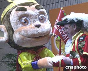 一月十九日在香港举行的“2004国泰航空新春国际汇演”发布会上,猴年吉祥物“美猴王”在会上热烈欢迎参加汇演的各国表演队。作者:钱兴强