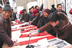 河南许昌尚集镇书画村的农民书法家们为村民义写春联。尚集镇民风古朴,文化氛围浓厚,一直保留着习书的传统。作者:慎重