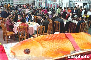 元月二十日农历年廿九,广州市市长张广宁、市政协主席陈开枝等市负责人前往广州老人院探望住在这里的近八百名老人,并与老人们共进团年饭。一条寓意“年年有余”的大鱼为老人院增添了很多欢乐气氛。作者:罗仰明