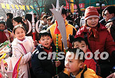 一月二十五日,几位学童在厂甸庙会购得各类充气的仿“古代兵器”满载而归。中新社记者:邹宪