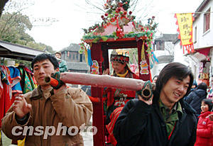 水乡古镇同里春节期间推出坐花轿过三桥活动,增加了节日气氛,众多游客兴致勃勃地坐上了四人抬的大花轿,一边倾听着唢呐等古乐的伴奏声,一边观赏着水乡古镇的景色。作者:蒋振江