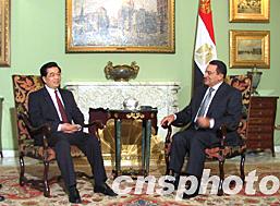 当地时间一月二十九日,中国国家主席胡锦涛抵达开罗,开始对埃及进行国事访问。图为胡锦涛与埃及总统穆巴拉克举行会谈。中新社记者齐彬/摄