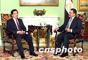 当地时间一月二十九日,中国国家主席胡锦涛抵达开罗,开始对埃及进行国事访问。图为胡锦涛与埃及总统穆巴拉克举行会谈。中新社记者:齐彬