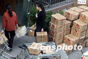 北京市出现新的SARS疫情后,许多批发商贩闻风而动紧急进货SARS消毒液。四月二十三日下午,北京西城区天意市场的一家商贩将新进的“84消毒液”运进货柜。“84消毒液”是北京地坛医院研制的专门杀灭肝炎病毒的消毒液,对杀灭SARS病毒有明显效果。中新社记者:任晨鸣