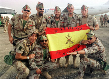 4月28日,248名西班牙最后一批驻伊作战士兵乘飞机从科威特回国。图为驻伊拉克的西班牙士兵到达西班牙西南部的Badajoz后与一面军旗合影。