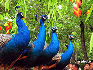 动物大巡游,是山东济南动物园“五·一”黄金周的主打节目,丰富的表演形式,众多的动物种类,让游客大饱眼福。2004年5月3日,让人喜爱的蓝孔雀站在巡游花车上傲气十足。希牛 摄