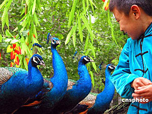 一儿童与孔雀逗乐