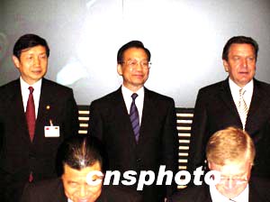 中国总理温家宝四日上午参加在柏林召开的中德高技术对话论坛第三次会议开幕式时称,中德高技术合作潜力巨大,前景广阔,中国将采取更有力的措施保护知识产权。图为温家宝总理(中)和德国总理施罗德出席中德高技术项目合作签字仪式。作者:蔚中