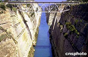 科林斯运河位于希腊首都雅典西南与伯罗奔尼撒半岛地峡处,完成于1893年,长6公里,宽23米,河面距地面桥梁深达约80米,如利刃将半岛与大陆笔直地切开。该运河由拖轮牵引仍可通过万吨轮船。作者:田地