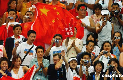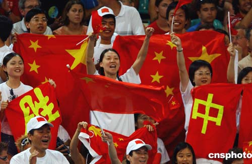 当地时间8月19日,在中国选手张宁与荷兰选手之间进行了女子羽毛球单打比赛的决赛,图为场外观众为中国队呐喊助威。