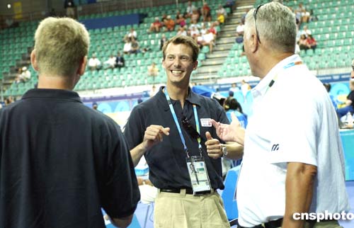 图为丹麦王子弗雷德里克亲自到奥运赛场观看希腊队的比赛。