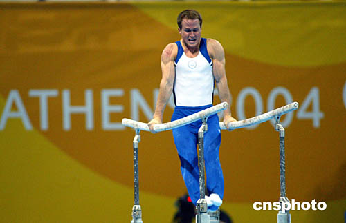在当地时间8月18日举行的男子体操个人全能赛中,美国选手哈姆夺得冠军。图为他在双杠项目上的表现。