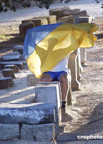 当地时间8月18日,乌克兰选手比洛诺格获得男子铅球比赛冠军后,独自一人披着国旗坐在雅典遗留的古废墟之中。