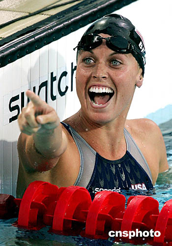 在当地时间8月19日举行的女子200米蛙泳比赛中美国选手阿曼达-比尔德勇夺金牌。图为她在得知自己夺冠后欢呼的镜头。